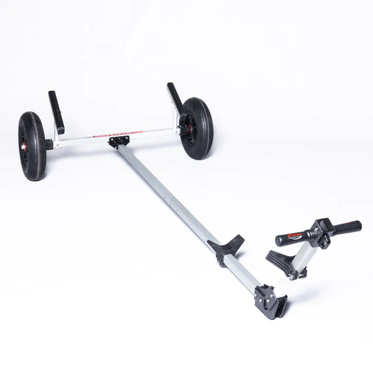 The Laser Narrow Wheel Base dolly is ideal for narrow ramps and pathways. The wheels lie completely inboard of gunwales. The hull rests on padded, pivoting tubes instead of a sling.