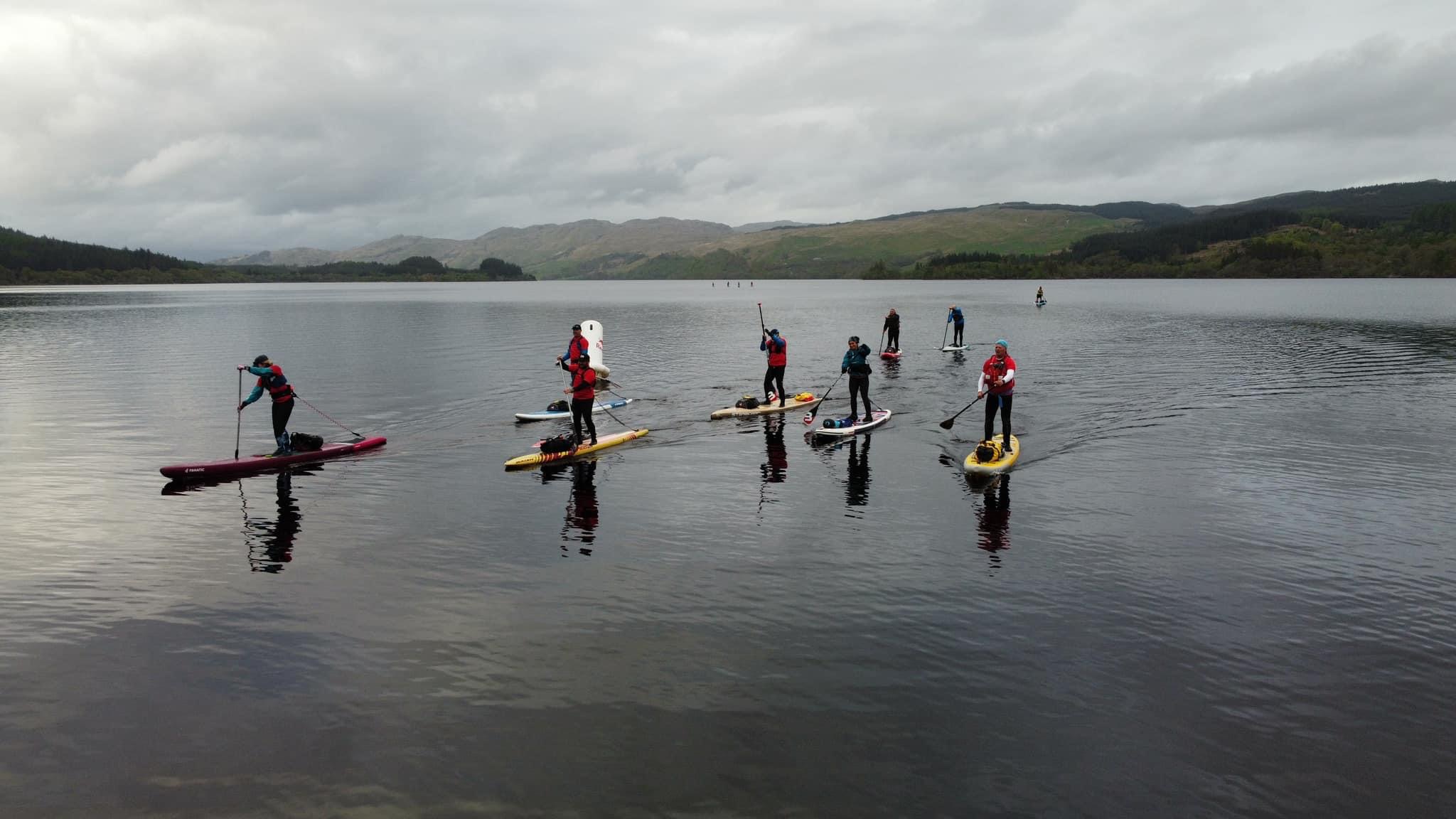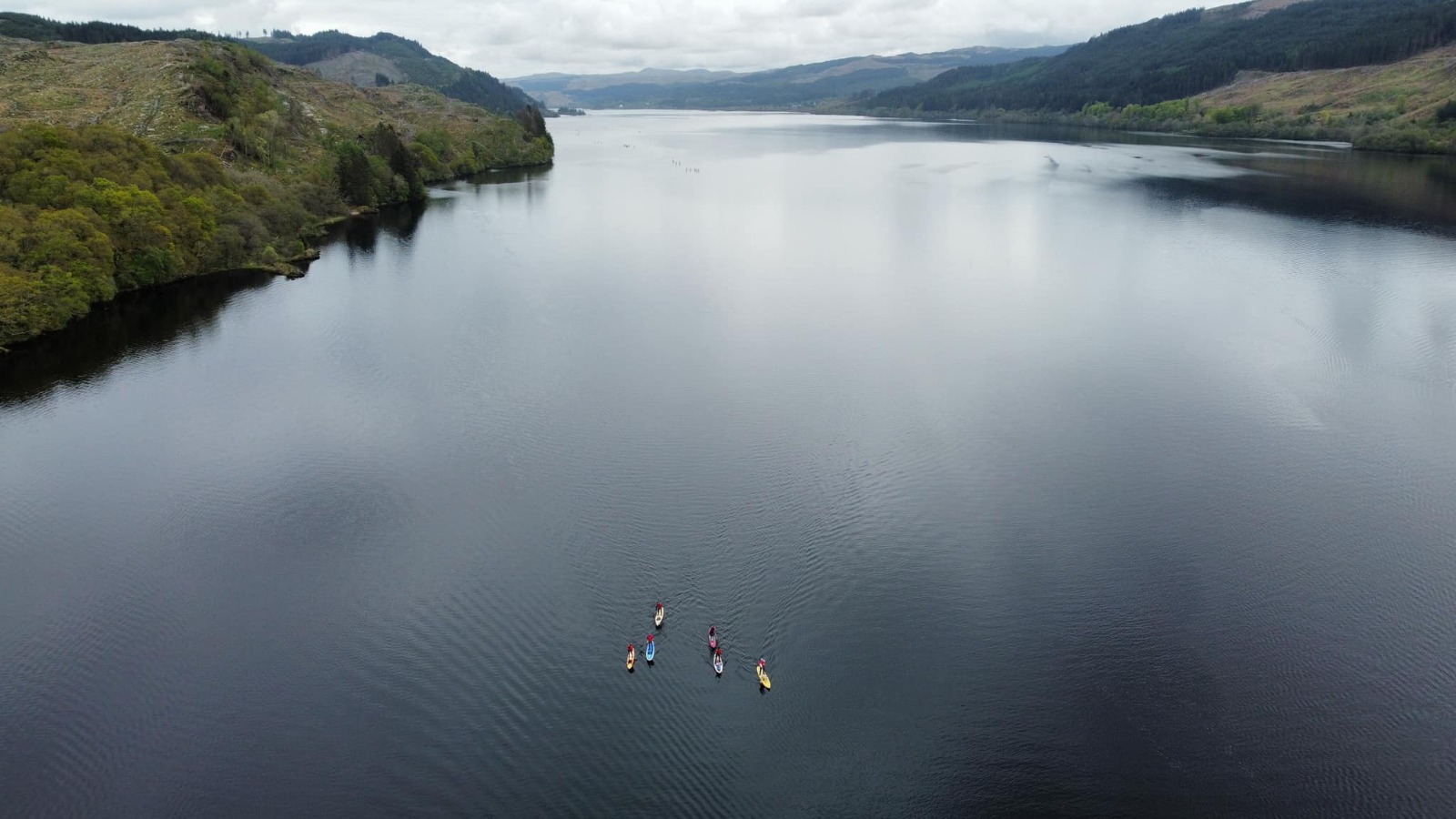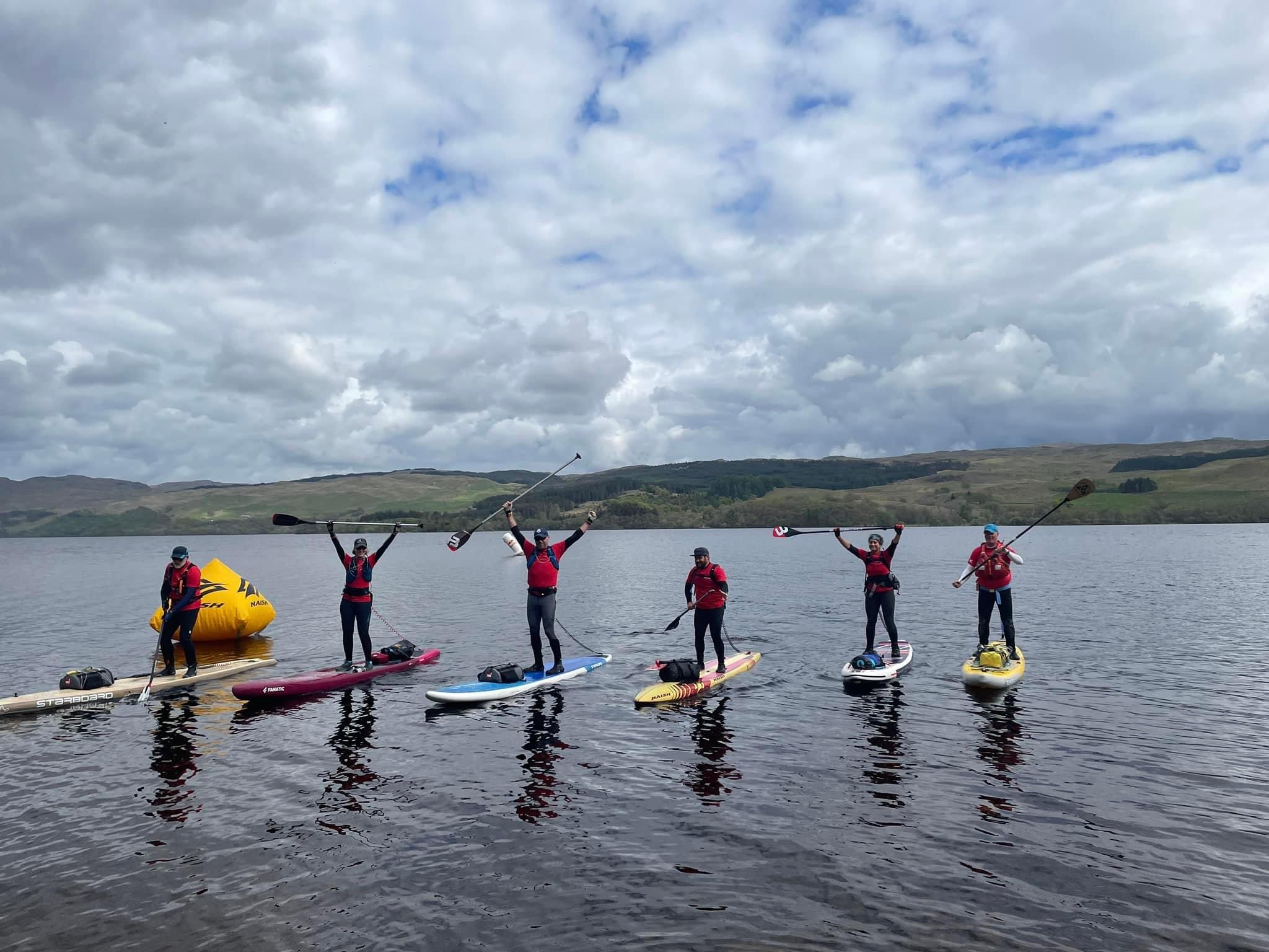 Day two dawned clear and wind-free, much to the relief of all the paddlers! A few light zephyrs combined with general exhaustion from the day before meant that there was almost an unspoken agreement to ‘try this drafting lark’. We managed to keep that going for around 6km and made really good time. Team goals… check! The rest of the day stayed flat, and a wee tailwind most of the way back. The only drama was when the safety boat roared past and we went from paddling 6 abreast to completely scattered across the Loch (some surfed the wash, others turned towards it!).  We regrouped for a final draft session and came in to the Red Bull Arch with the tunes blaring, boogying away!